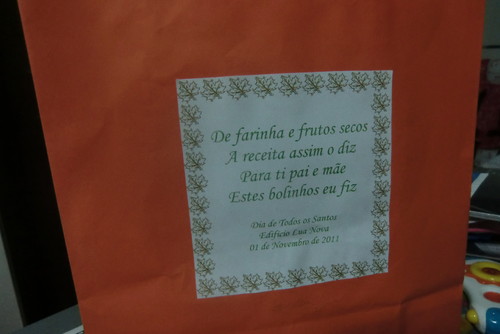 A Dona Carlota fez este saquinho para trazer o bolinho para a mamã e para o papá, e pensámos percorrer as ruas na manhã do dia de todos os santos e pedir pão por Deus