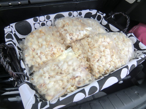 Cestinho com 18 sacos de pipocas para distribuição pela pequenada. Ficaram contentes e a educadora achou originais, ideia aprovadíssima também e uma foto da aniversariante a fazer macacadas.