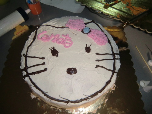 Bolinho metade de iogurte, e outra metade de cenoura recheado com doce de ovos e a pedido da porquinha uma Kitty, estava fofinho e delicioso, foi esta a crítica da aniversariante. Logo aprovadíssimo.