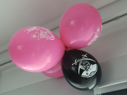 Na sala reinavam balões, e claro as caveiras tinham que entrar na decoração.