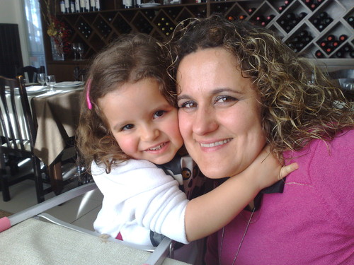 A dar uma beijoca à educadora que a acompanhou, não liguem à vestimenta da Carlota, porque fez um xixizito na hora da sesta e teve que vestir as calças que trazia na mochila de reserva.